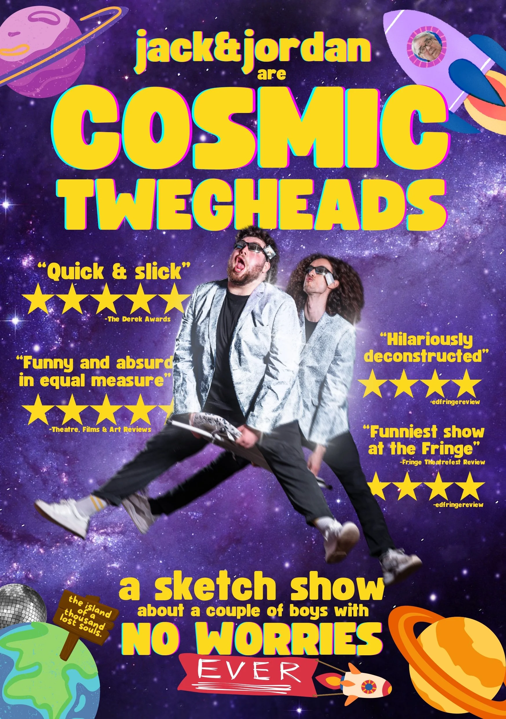 Lifelong best buddies Jack & Jordan are the COSMIC TWEGHEADS in this story-driven sketch show about space, The Two Ronnies, and a couple of boys with no worries (ever).